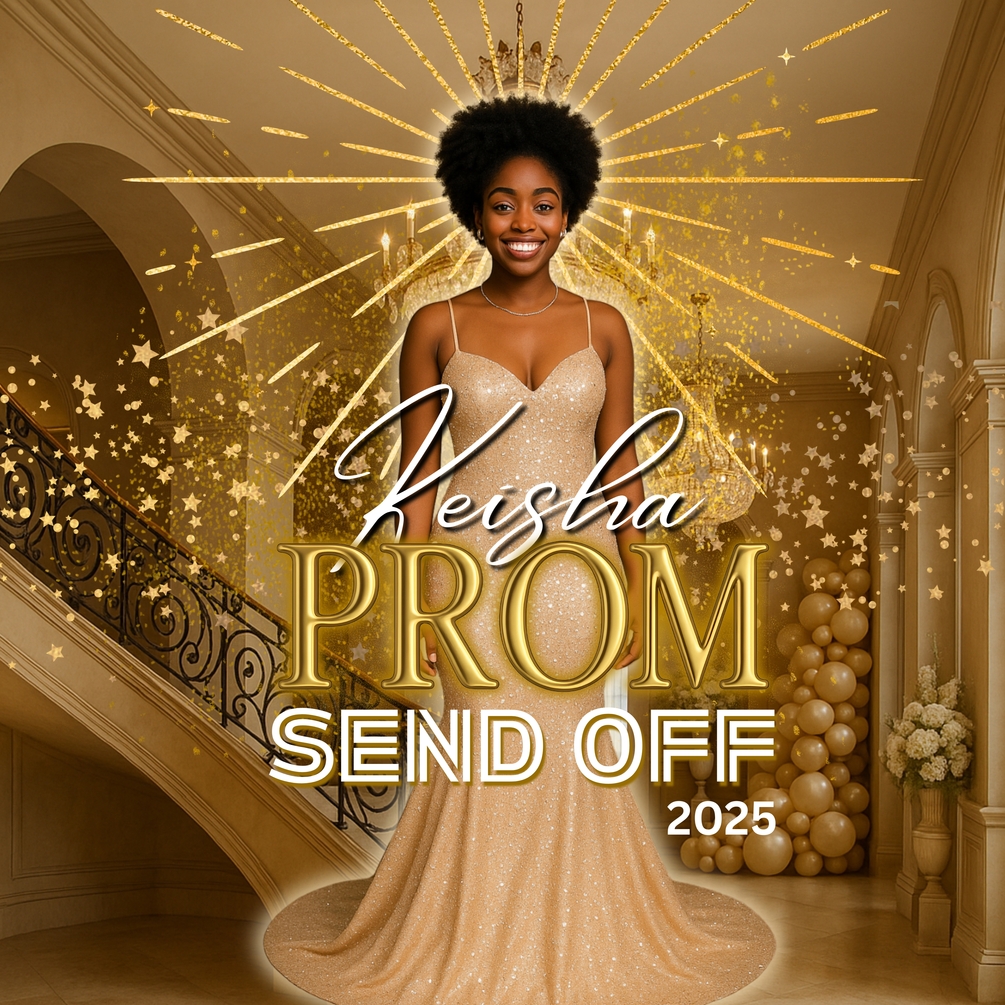 Give your 2025 prom send-off a golden glow with this elegant, fully editable Canva template. Designed with champagne tones, a starburst chandelier effect, and luxe gold detailing, this digital backdrop is perfect for creating show-stopping photos and memories.